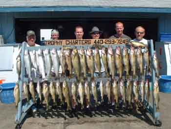 A great September! Fishing couldn’t be much better than it is right now off of the shores of Ashtabula, OH. Whether you’re gong for the jumbo Yellow Perch or the late season Walleyes, you won’t be disappointed. Even the big two-day blow, and rain that we had last as the remnants of hurricane Francis passed over Lake Erie did little to slow thing down. The Walleyes have still not moved out of the area. We are doing very well in 72 ft. of water, anywhere from 10 to 17 miles out. The fish are quite deep but are very active. Very few Steelhead are being caught this season but we are still getting a few almost every trip out. This past Saturday we had a group from Wisconsin that just couldn’t get over the size of our Walleyes! Out of the fine batch of fish that we had, two were over 10 lbs. and the big Walleye of the day came in at 12 lbs.; a nice reward after driving so far.