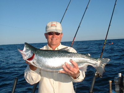 | Most of these fish are now being taken in the 60 - 70 ft. depths. Aboard "The Trophy" we have switched to a wire line and crankbaits program off the big planer boards. The big Dipseys have been very productive as well. The bottom line is when you are heavy into the fish, everything works. We've waited a long time to see fishing this good. |