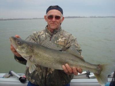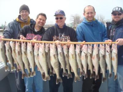 | It started out OK. Last Monday I took my boys right back to where we fished last Sunday in close because of the strong south winds and we did even better having 5 limits of Walleyes before 11am. Nice! Tuesday with me knowing that the Walleyes were biting and the weather still being nice, sadly I had no trip. All along now the forecasts started slowly changing with hints of impending deteriorating weather to come. Wednesday was the beginning of the end. Inland they were calling for 70’s. On the lake we were greeted with very raw stiff northeast winds, cold rain and thunder storms. It’s a good thing I had a good group of very talented jig fisherman onboard because it was not pretty out there. Still they went on to pull 6 limits of Walleyes before the conditions went from bad to worst. Nice work guys ! |
