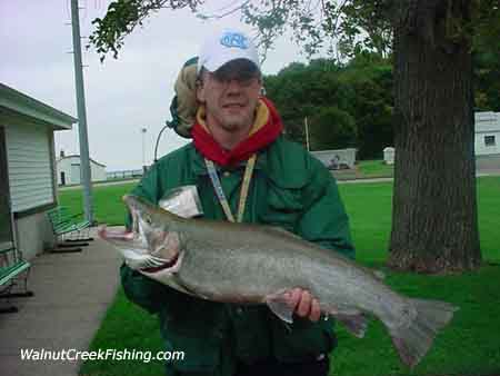 | Bruce Ankeny of Brookville, PA caught this 9 pound 8 ounce male in Walnut Creek. It is his first Steel head. He was fishing with a grub and it caught an emerald shiner and the shiner caught the Steelhead. |