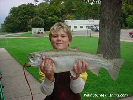 | Eleven year old Dakota Hansel from Duncannon, PA caught this 8 pound in Walnut Creek. It also was 26 inches long. He caught it on orange/green/pink (mixed together) Powerbait. PERCH AND WALLEYE: I have not heard of anyone doing any good on the Perch or the Walleye. People are out trying for them but not having much luck. I have heard of a few boaters getting some Perch off the Lighthouse but that is only hearsay and I don't like to report anything unless I see it. |