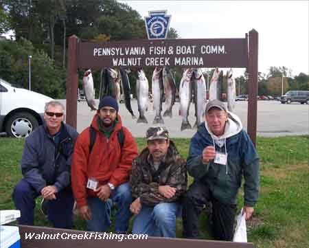 | STEELHEAD: Bob Will, William Bishop, Dave Goggin and Jim Will from Pittsburgh came in with their limit of Steel head. They were out in front of Walnut Creek with their Captain. They were using Bombers and Jr. Thundersticks. The colors were Black (Bombers) and Orange (Jr. Thundersticks). The weather has been nasty so that is all the pictures I have for this report. I has rained off an on all day Wednesday and on Thursday the creeks were running pretty good. The water was cloudy but it wasn’t real bad. There is some fish in even though I haven’t had any come in here and I didn’t see any get caught but the guys were saying that there is fish in. Most people are using power bait and egg sacs and the fly fisherperson is using wooly buggers.