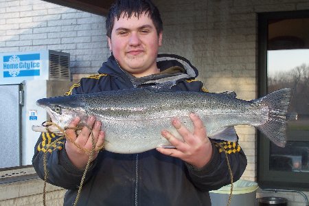 | STEEL HEAD: Fifteen year old Robert Welsh of Irvonia, PA caught this nice 1 pound 2 ounces Steelhead of the Channel wall. He was caught on eggs. His girth was 18 inches and he was 28 ¼ inches long. The fishing has not been too good lately. The water in the creek is clear and there are a lot of leaves. We need some rain to stir up the water and bring in some fish. There is an 80% chance of rain and Thunderstorms tonight and tomorrow. Then there’s a 40% chance of rain through Tuesday so that should bring some fish in. The restrooms will be closed at night when the building closes.  We are open seven days a week until December then we will be open Friday, Saturday, and Sunday until either the 15th or the 22nd.  I will let you know when I do.  |