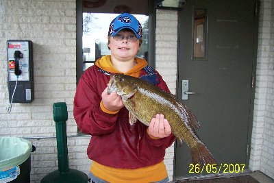 | Eleven year old Zach Shute of Buffalo, NY was out with Ron and he came in for a citation for this nice 5 pound 5 ounce Smallmouth.  It was 20 ¼ inches long and had a girth of 17 ¼ inches.  It was caught on a minnow in 25 ft of water east of Walnut Creek. WALLEYE:  |