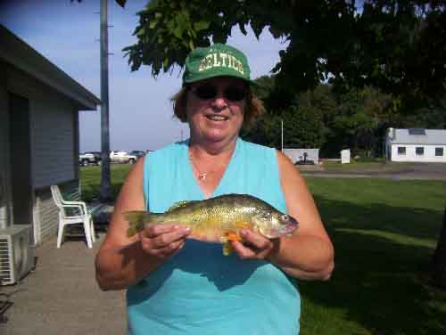 | PERCH: Carol Riblett of Erie, PA brought in this nice sized Perch for Angler Award. It weighed 1 pound 7 ounces, was 14 inches long and had a girth of 10 ¾ inches. She caught it in 58 ft of water off the GE stack on the East side. She was using minnows. |