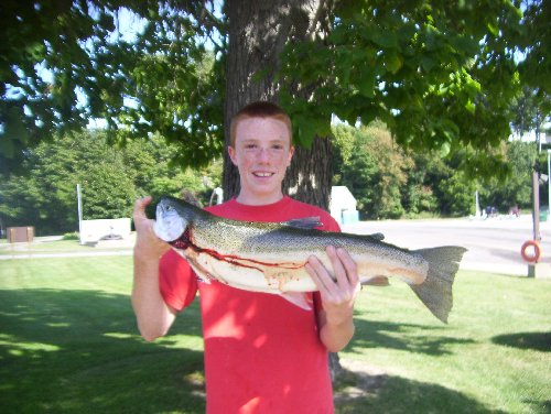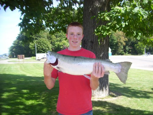 | STEELHEAD: Fourteen year old Cody Weimer of Irwin, Pa brought in this pretty Steelhead. It was 8 pounds 3 ounces and was 28 inches long with a girth of 16 inches. He caught it off the North wall at Walnut Creek on Orange power bait. |